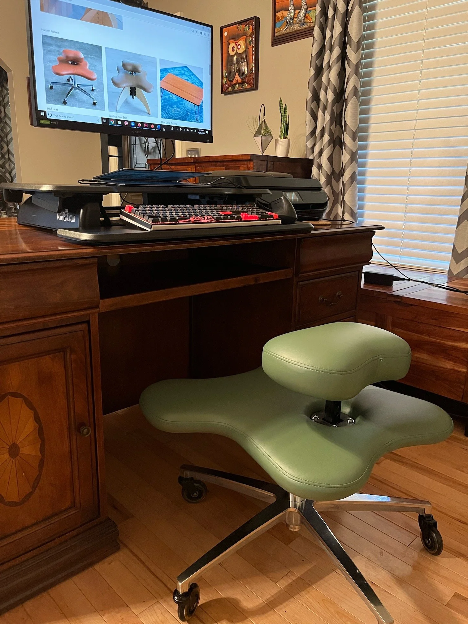 During a particularly challenging and painful period, a colleague told me about the Ikaria Soul Seat. Desperate for a solution and trusting her testimony, I immediately Googled the Soul Seat. There were various knock-offs that were far more affordable, but I was apprehensive to waste even a few hundred dollars on something that might not work for me. I mean, let’s be honest, the Soul Seat is an unusual type of chair. So, I started asking myself those aforementioned questions, over and over. I decided that my quality of life is worth well more than the cost of a Soul Seat and, if it helps to reduce my mid-back pain, it is money well spent. Knowing that Ikaria offers a money-back guarantee on their new items, I purchased my first Soul Seat in the Arugula Ultraleather Pro upholstery.