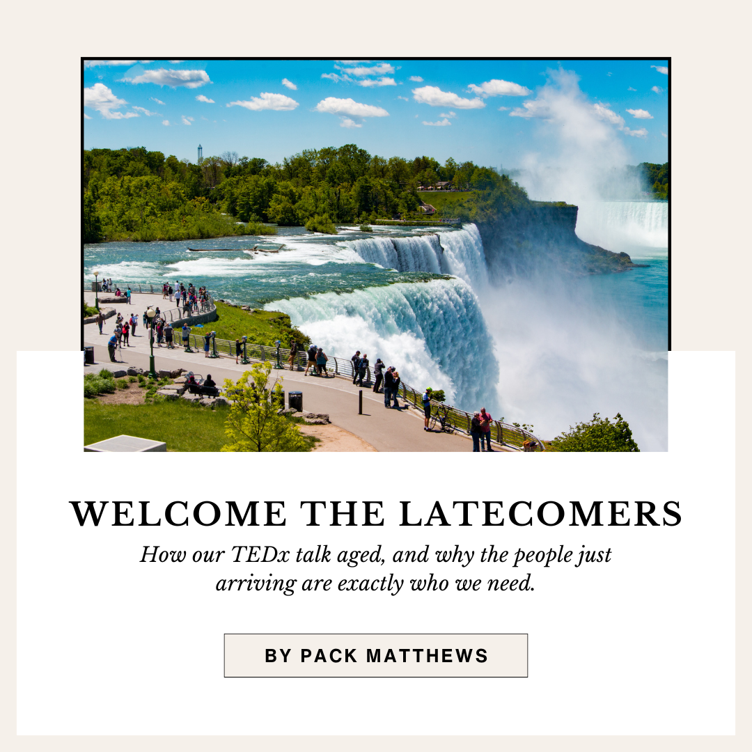 The image I keep returning to is the Niagara River. Imagine you're in a boat drifting downstream. There's no change in the current you can feel, no sound of the falls — nothing to tell you anything has shifted — just a sign on the shore, understated as a speed limit: Point of No Return. By the time most people notice it, a few in the boat are already paddling hard for shore. If you're one of the ones who spotted that sign early, your job right now isn't to hold a grudge, it's to get every available set of hands paddling.